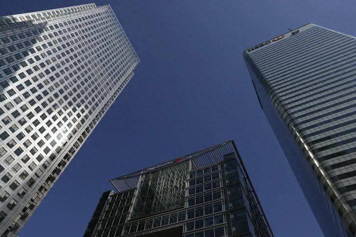 这是2018年5月15日拍摄的位于英国伦敦金丝雀码头的汇丰银行(右)、美国银行(中)。新华社记者韩岩摄