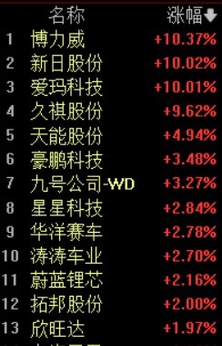 早盘,两轮车板块表现活跃。板块内2只个股涨停,爱玛科技、新日股份涨停,博力威涨超10%,久祺股份涨超9%,天能股份涨超4%,豪鹏科技、九号公司涨超3%。