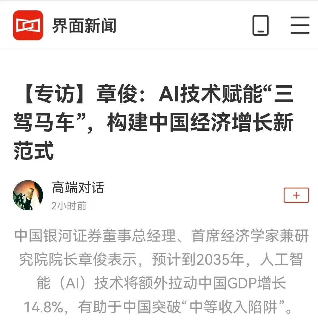 他进一步指出,AI技术引领的新一轮科技革命,将成为突破中国经济转型瓶颈的核心驱动力, 通过“内生+外延”两条路径共同构成经济增长“双引擎”。
