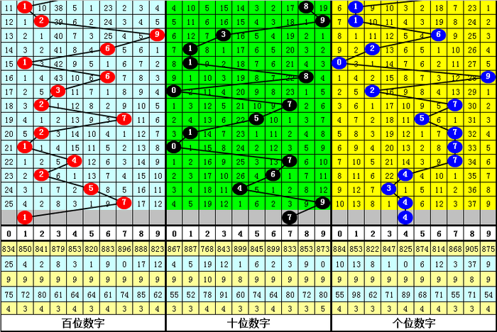 (2)在号码频次方面,开出个数最少的三个号码为:3、0、8,一般来说这三个号码不会同时出现;开出个数最多的四个号码分别为:1、7、2、5,本期看好这四个号码中包含1-2个开奖号码,注意号码7。