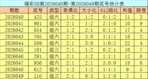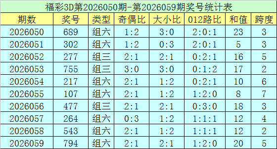 上期回顾:福彩3D第2026059期开奖号码为794,组选类型为组六,奇偶比为2:1,大小比为2:1。
