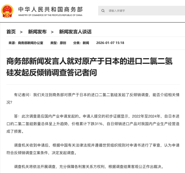 有记者问:我们关注到商务部对原产于日本的进口二氯二氢硅发起了反倾销调查,能否介绍相关情况?